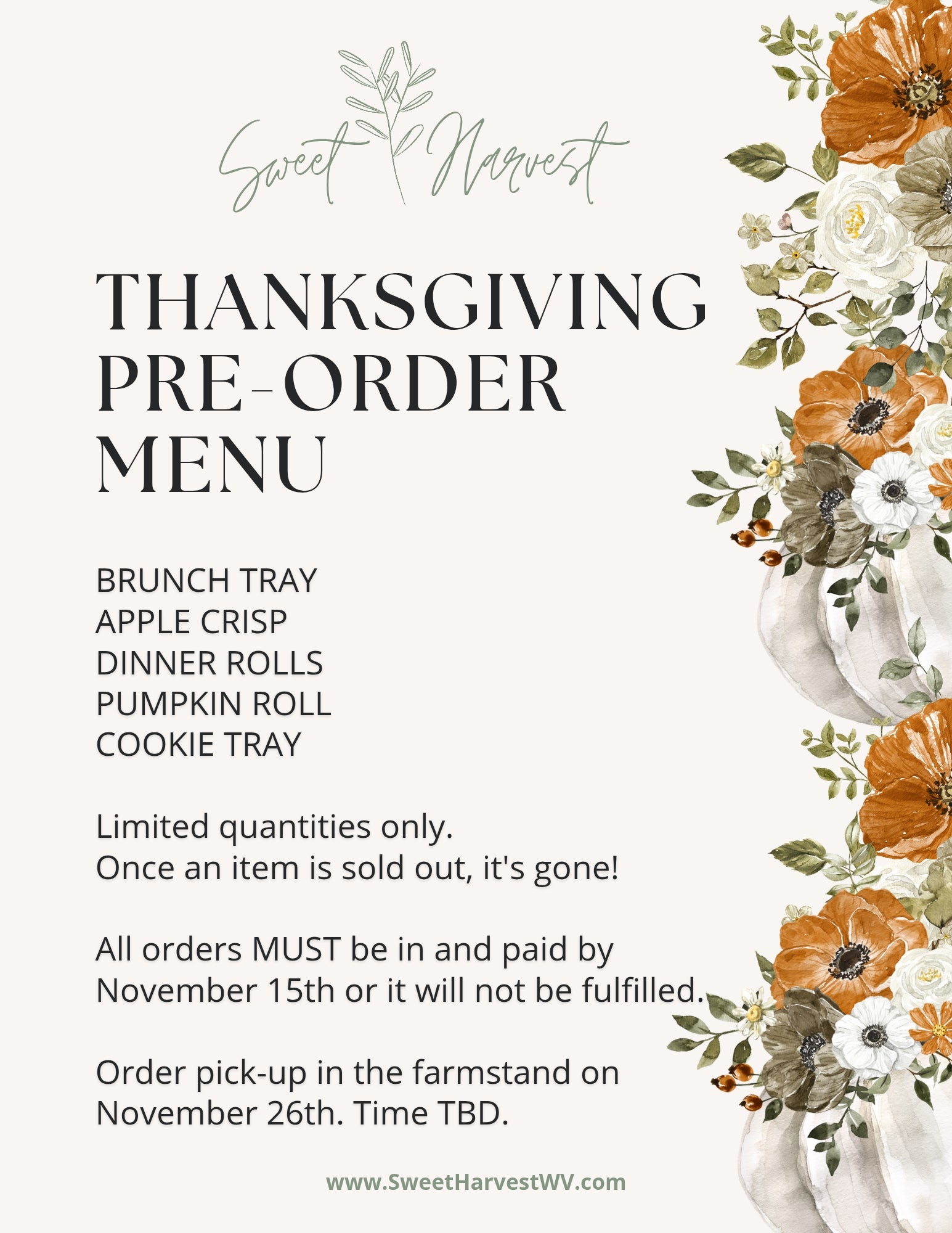 Orders close on November 15th. Orders MUST be paid in FULL by November 15th or your order will NOT be fulfilled. Order pick-up will be Wednesday, November 26th. Time TBD, flexible.